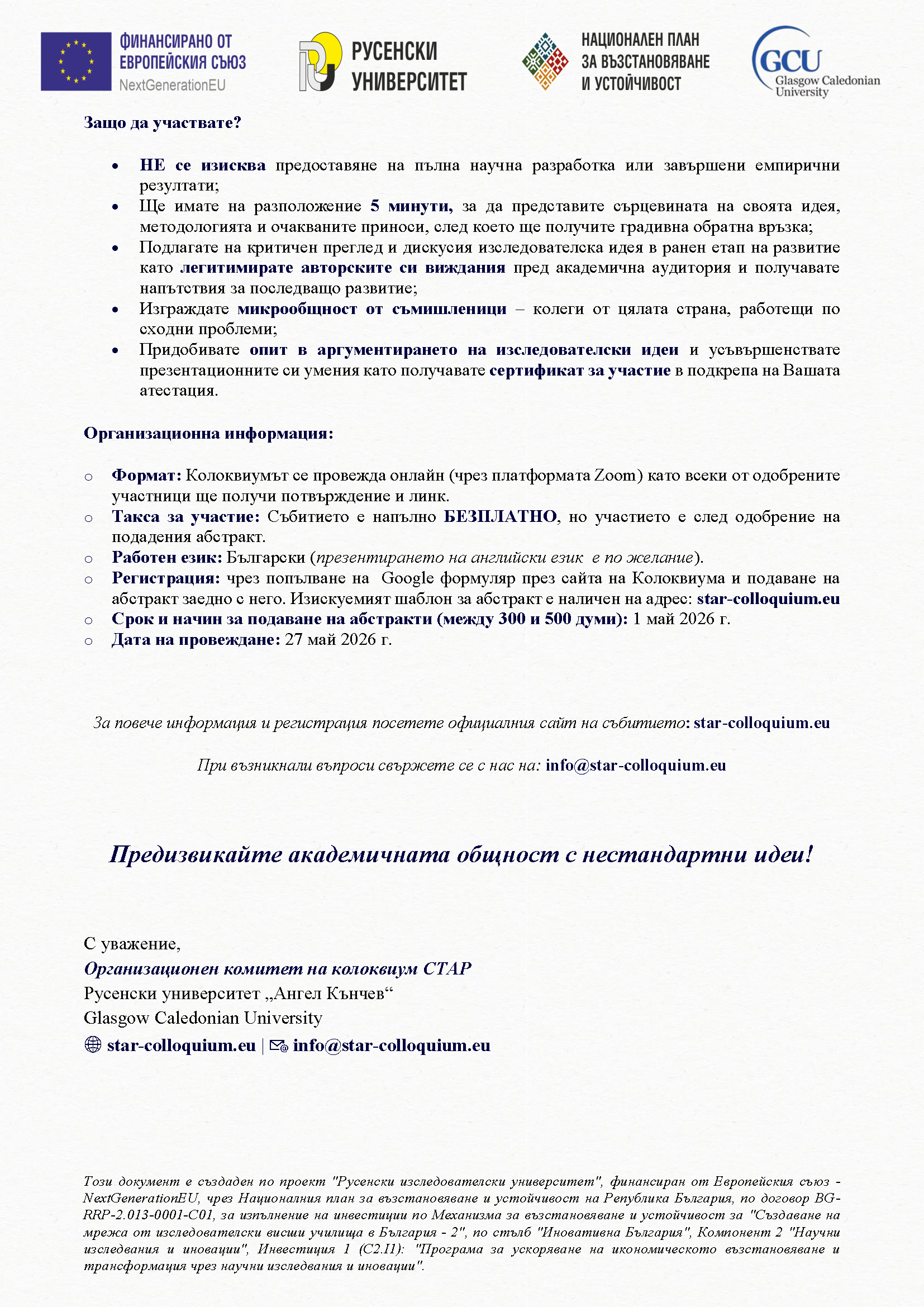 Подробна информация за тематичните направления, етични и други изисквания, както и достъп до регистрационната форма ще откриете на нашия официален уебсайт: star-colloquium.eu