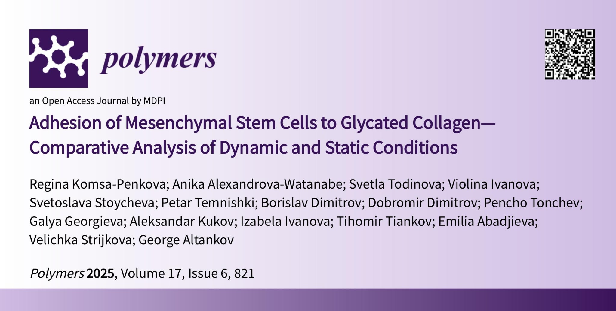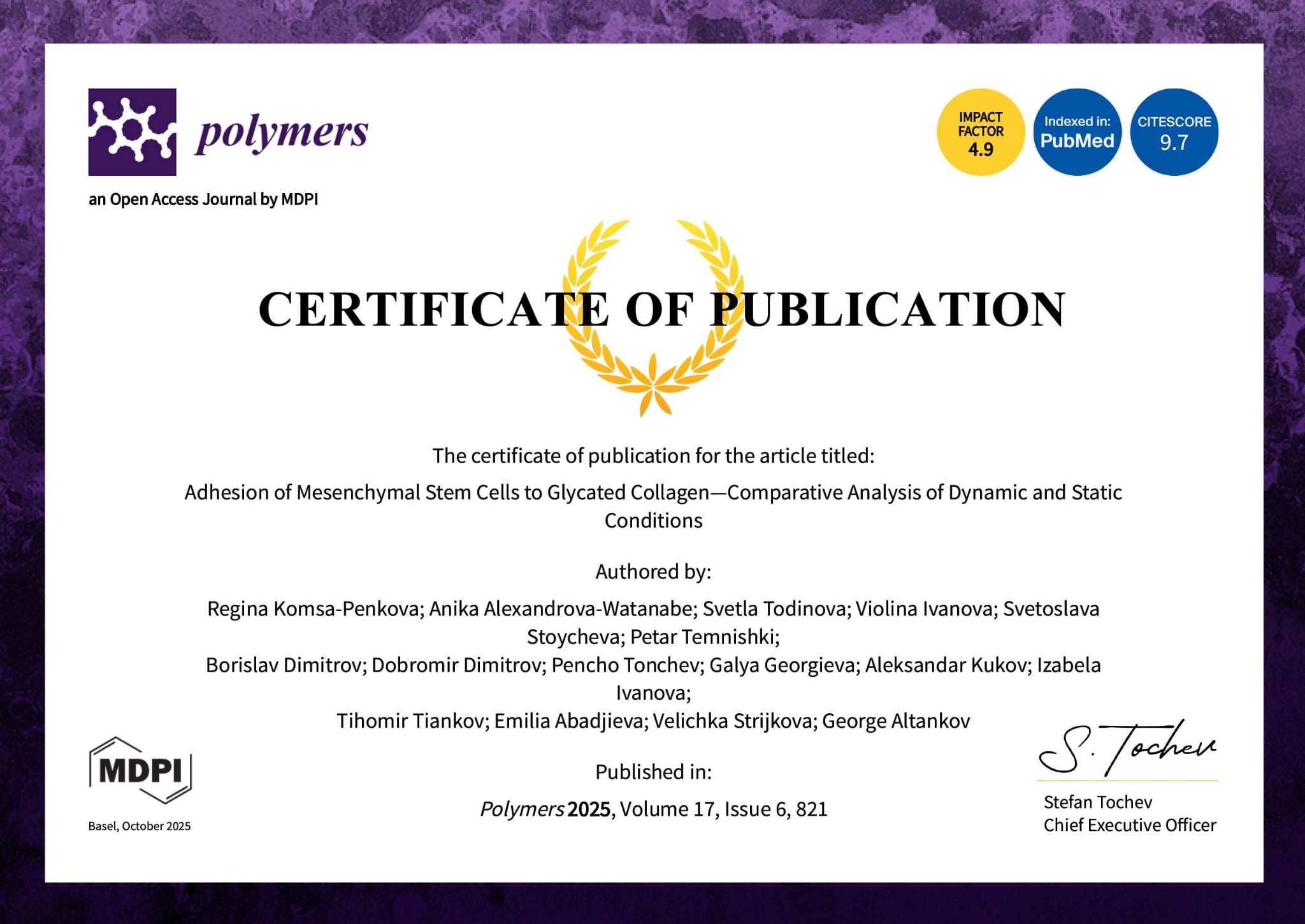 Втората публикация – „Adhesion of Mesenchymal Stem Cells to Glycated Collagen—Comparative Analysis of Dynamic and Static Conditions“, публикувана в списание Polymers, надгражда тези резултати чрез сравнителен анализ на клетъчната адхезия при стандартни лабораторни условия и в динамична среда, близка до реалните физиологични условия в човешкото тяло.