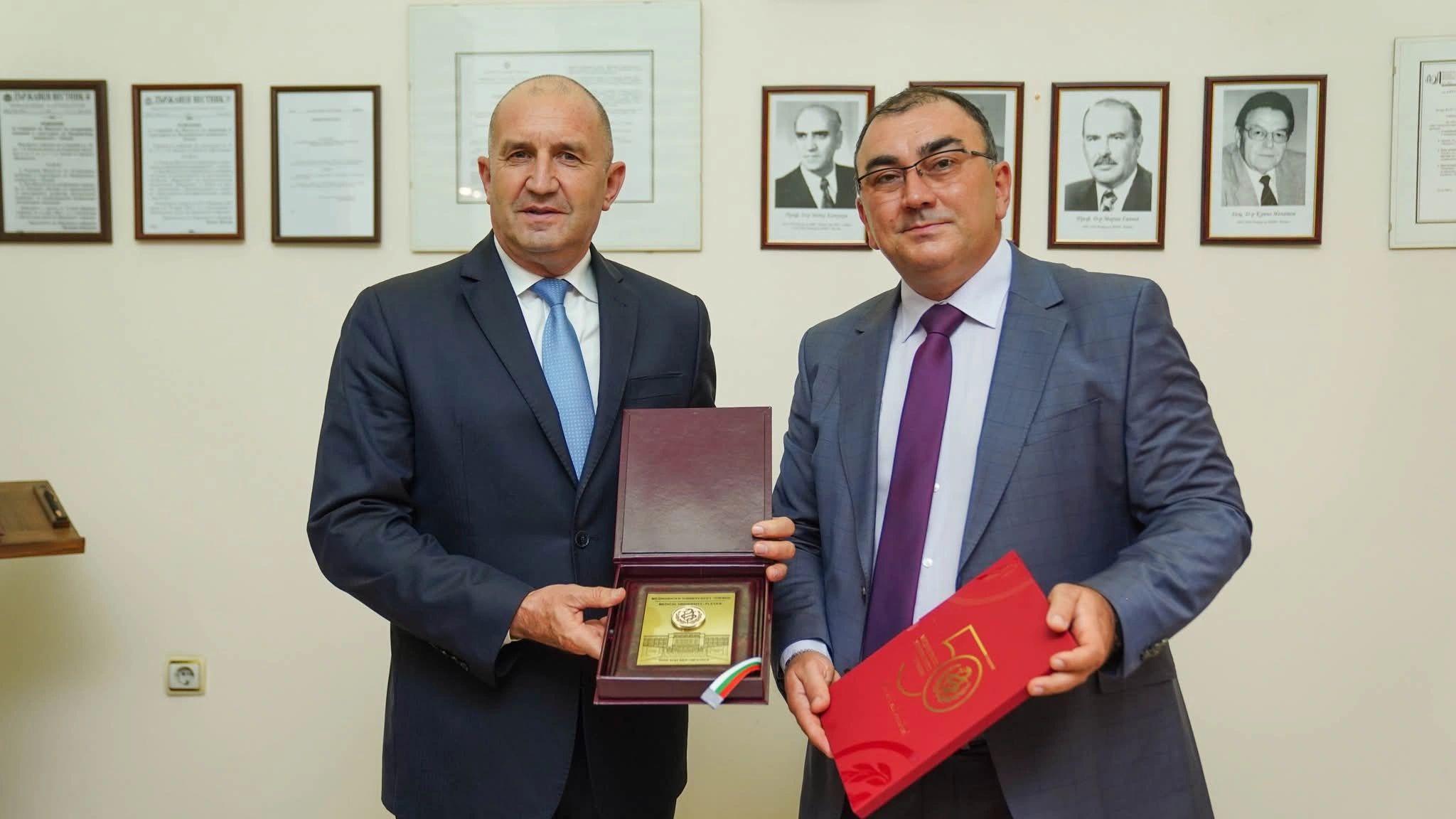 Rector Prof. Dimitrov presented President Radev with the University’s honorary plaque and the commemorative almanac “50 Years of Medical Education and Science in Pleven.”