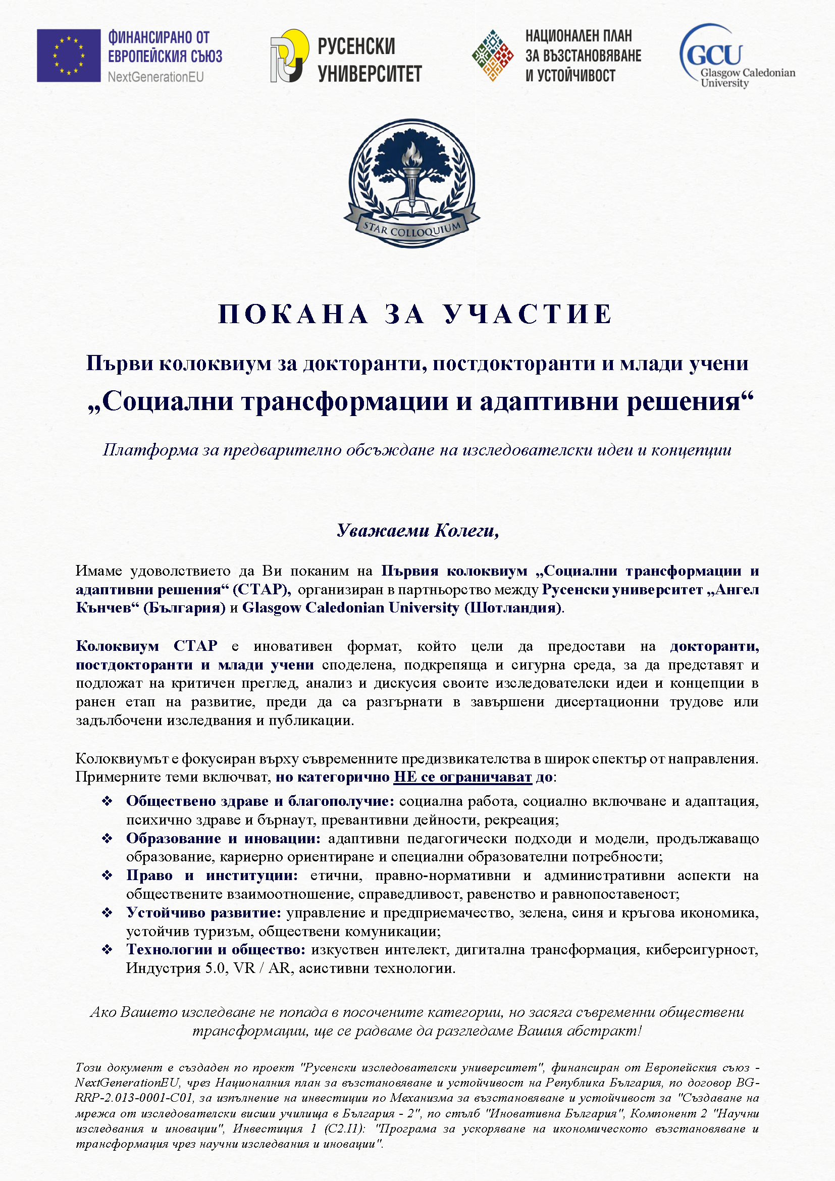 Имаме удоволствието да Ви поканим да вземете участие в Първия колоквиум за докторанти, постдокторанти и млади учени "Социални Трансформации и Адаптивни Решения" (СТАР) - иновативен академичен форум, организиран съвместно от Русенски университет "Ангел Кънчев", България, и Glasgow Caledonian University, Шотландия.